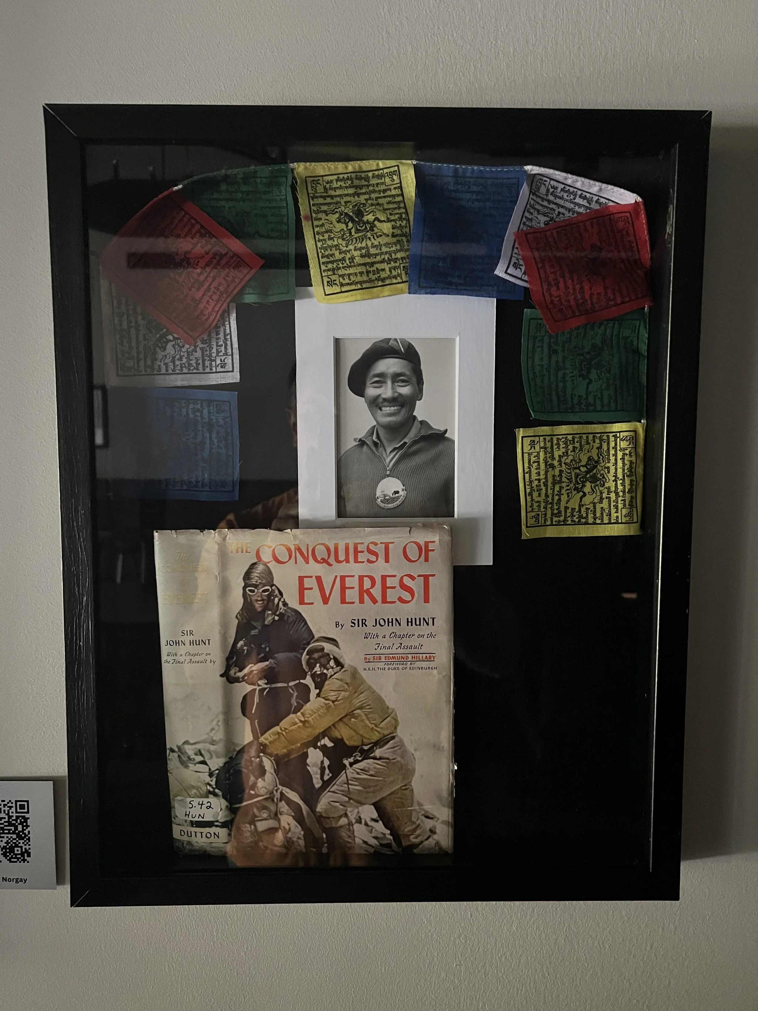 Residing in the Lost Worlds Charlotte Taproom is one very unique taproom artifact. On the walls of the event room is a frame with three items inside. First, is the copy of Conquest of Everest by Sir John Hunt. This book tells the story of the Hunt Expedition’s attempt to climb Mount Everest and the first ever successful summit. The second item is a prayer flag which serves primarily decorative purposes as prayer flags abound in the area around Mount Everest. The third item is of special note. It is a black and white picture of a smiling man of Tibetan/Mongolian descent, Tenzing Norgay. Tenzing is sherpa mountain climber who was one of the first two men to summit Mt. Everest.